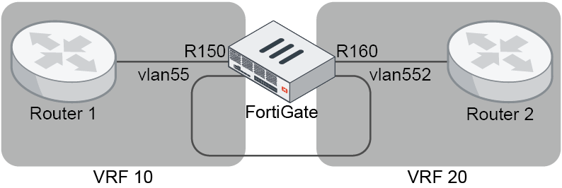 config router route-map edit "from106" config rule edit 1 set match-ip6-address "1" next end next edit "from206" config rule edit 1 set match-ip6-address "2" next end next end - Configure the IPv6 route leaking (leak route 2000:5:5:5::/64 learned from Router 1 to VRF 20, then leak route 2009:3:3:3::/64 learned from Router 2 to VRF 10):