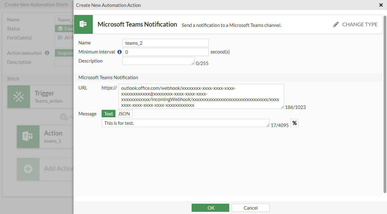 config system automation-action edit "teams_1" set action-type microsoft-teams-notification set uri "outlook.office.com/webhook/xxxxxxxx-xxxx-xxxx-xxxx-xxxxxxxxxxxx@xxxxxxxx-xxxx-xxxx-xxxx-xxxxxxxxxxxx/IncomingWebhook/xxxxxxxxxxxxxxxxxxxxxxxxxxxxxxxx/xxxxxxxx-xxxx-xxxx-xxxx-xxxxxxxxxxxx" next edit "teams_2" set action-type microsoft-teams-notification set message "This is for test." set uri "outlook.office.com/webhook/xxxxxxxx-xxxx-xxxx-xxxx-xxxxxxxxxxxx@xxxxxxxx-xxxx-xxxx-xxxx-xxxxxxxxxxxx/IncomingWebhook/xxxxxxxxxxxxxxxxxxxxxxxxxxxxxxxx/xxxxxxxx-xxxx-xxxx-xxxx-xxxxxxxxxxxx" next end - Configure the automation stitch: