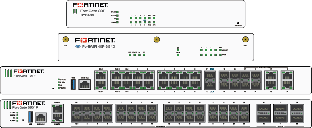 The following faceplates show examples of where the LEDs are typically found on FortiGate models: