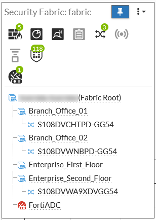 The Security Fabric widget provides a visual overview of the devices connected to the Fabric and their connection status. Hover of a device icon to view more information about the device.