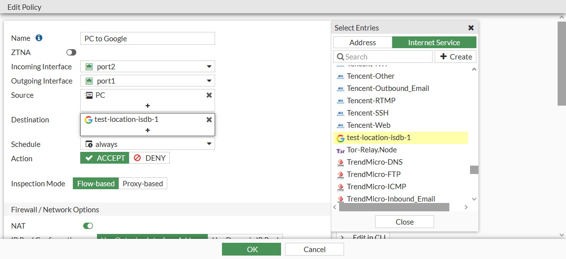 config firewall policy edit 3 set name "PC to Google" set srcintf "port2" set dstintf "port1" set srcaddr "PC" set internet-service enable set internet-service-name "test-location-isdb-1" set action accept set schedule "always" set logtraffic all set logtraffic-start enable set auto-asic-offload disable set nat enable next end