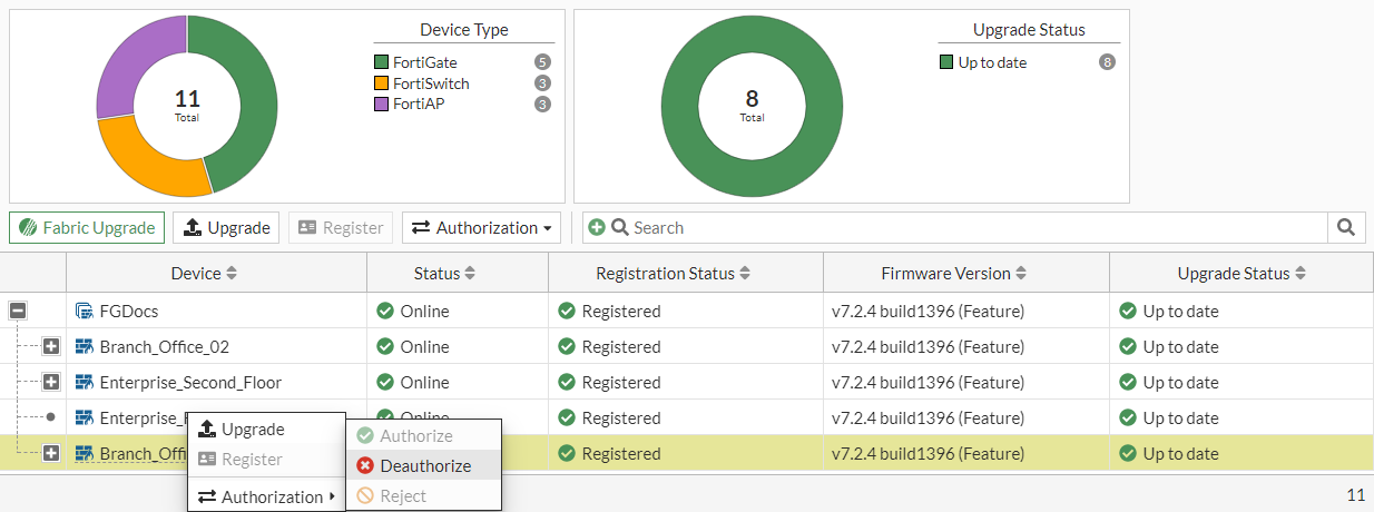 The deauthorized FortiGate's status is now listed as Unauthorized.