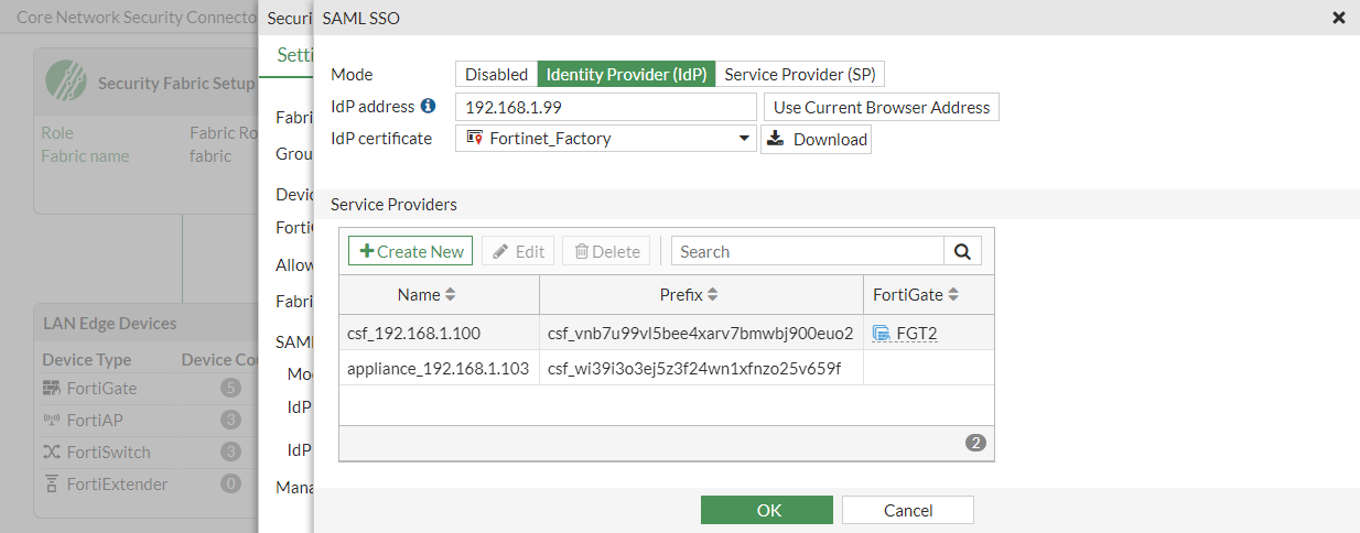 config system saml set status enable set role FAB-SP set server-address "192.168.1.99" endFortiAnalyzer will register itself on the FortiGate as an appliance.