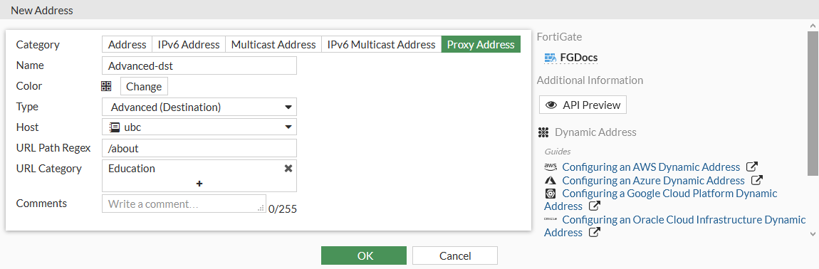 In this address type, a user can create an address based on URL pattern and URL category parameters. Once created, the address can be selected as a destination of a proxy policy. This means that a policy will only allow or block requests that match the selected address.