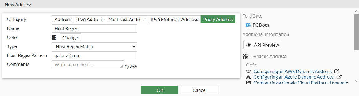 In this address type, a user can create a hostname as a regular expression to match the Host field in the Layer 7 header of a packet. Once created, the hostname address can be selected as a destination of a proxy policy. This means that a policy will only allow or block requests that match the regular expression.