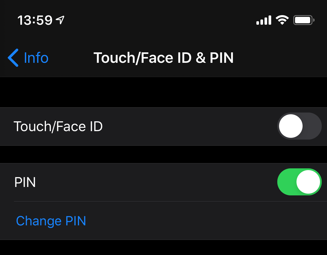 - Enable and set up a 4-digit PIN for the application. The PIN is required to be enabled before you can enable Touch/Face ID.
