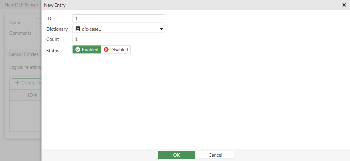 config dlp sensor edit "sensor-case1" config entries edit 1 set dictionary "dic-case1" next end next end - Configure the DLP profile: