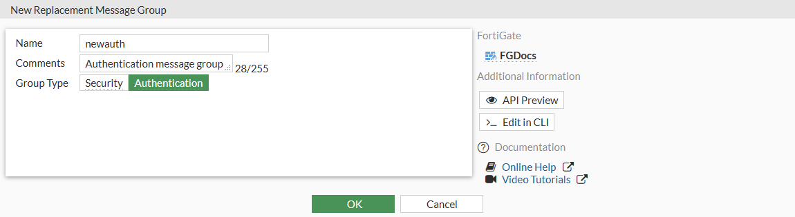In the following example, two replacement message groups are created. The UTM message group includes custom mail-related messages and is assigned to an email filter profile. The authentication message group has a custom authentication success message that is applied to a proxy-based firewall policy that has an assigned email filter profile.