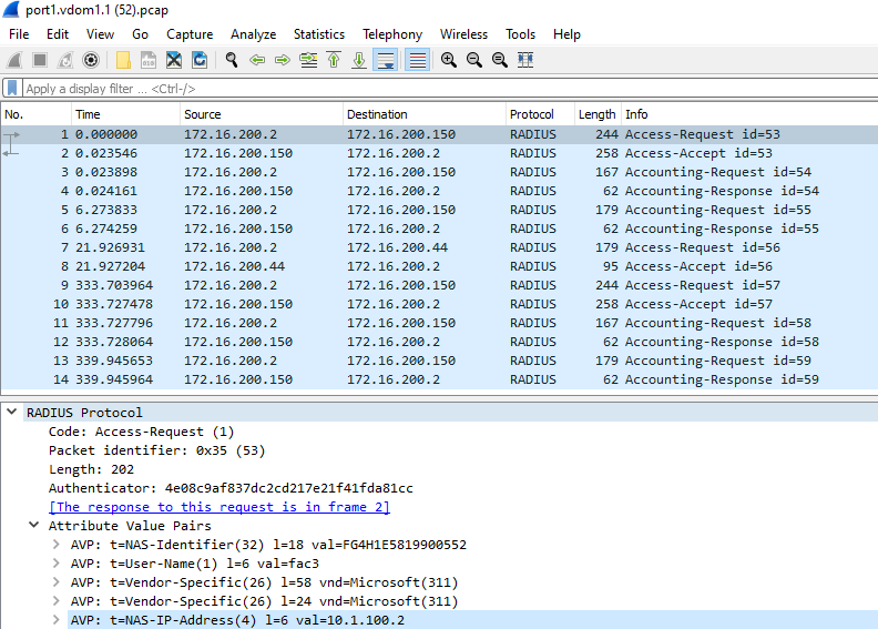 In this example, the user wants to present one FortiGate VDOM with different NAS-IPs to a single RADIUS server based on specific rules.