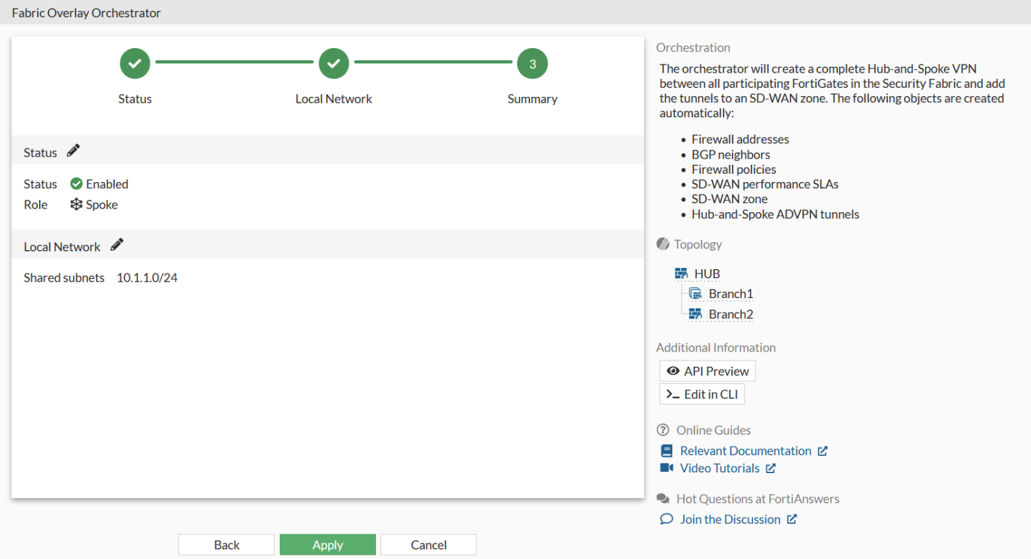 Click Next. As the downstream FortiGate updates, a Configuring spoke Fabric VPN from root FortiGate message appears The Summary page appears once the update is complete.