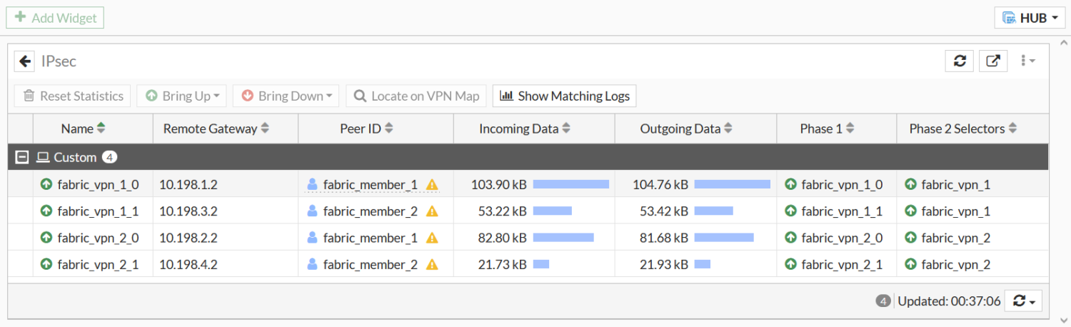 fabric_vpn_1_0tunnel was created for spoke 1-to-spoke 2 communication.In the GUI, go to Dashboard > Network and click the IPsec widget to expand it.