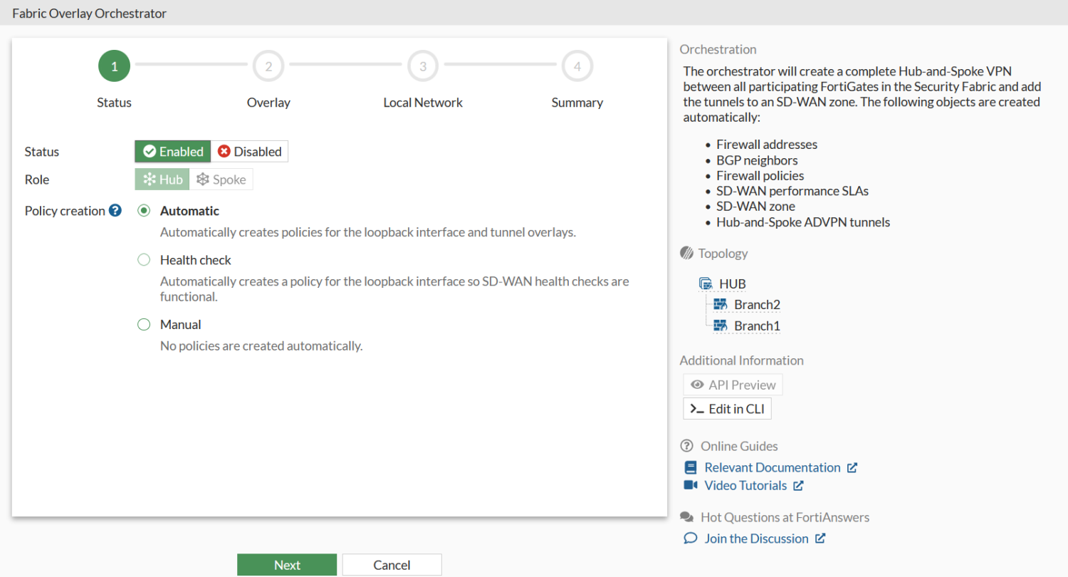 The FortiGate’s role in the SD-WAN overlay is automatically determined by its role in the Security Fabric. The Fabric root will be the hub, and any first-level downstream devices from the Fabric root will be spokes.