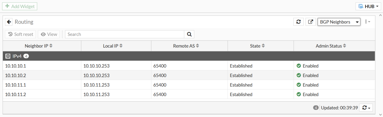 HUB # get router info bgp summary VRF 0 BGP router identifier 10.20.1.1, local AS number 65400 BGP table version is 11 1 BGP AS-PATH entries 0 BGP community entries Next peer check timer due in 43 seconds Neighbor V AS MsgRcvd MsgSent TblVer InQ OutQ Up/Down State/PfxRcd 10.10.10.1 4 65400 23 27 11 0 0 00:09:28 2 10.10.10.2 4 65400 16 16 11 0 0 00:06:36 2 10.10.11.1 4 65400 14 20 11 0 0 00:09:22 2 10.10.11.2 4 65400 7 11 11 0 0 00:03:22 2 Total number of neighbors 4
