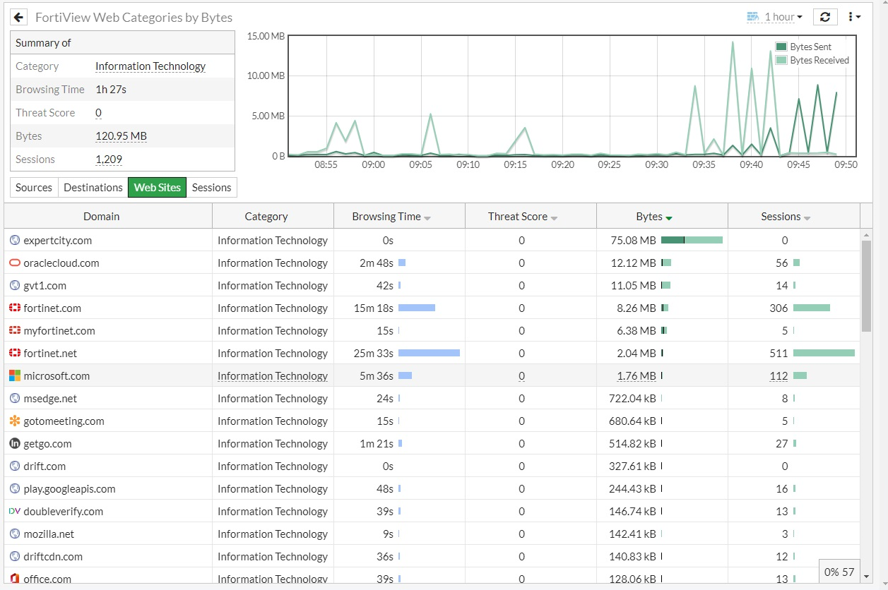 You can use FortiGuard web categories to populate the category fields in various FortiView monitors such as FortiView Web Categories, FortiView Websites or FortiView Sources. To view the categories in a monitor, the web filter profile must be configured to at least monitor for a FortiGuard category based on a web filter and applied to a firewall policy for outbound traffic.