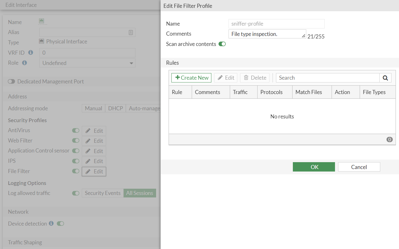 Each security profile has a predefined profile for One-Arm Sniffer called sniffer-profile. The sniffer-profile can be viewed or edited from the GUI through the Edit Interface page only. Please refer to the Example configurationfor a demonstration. |