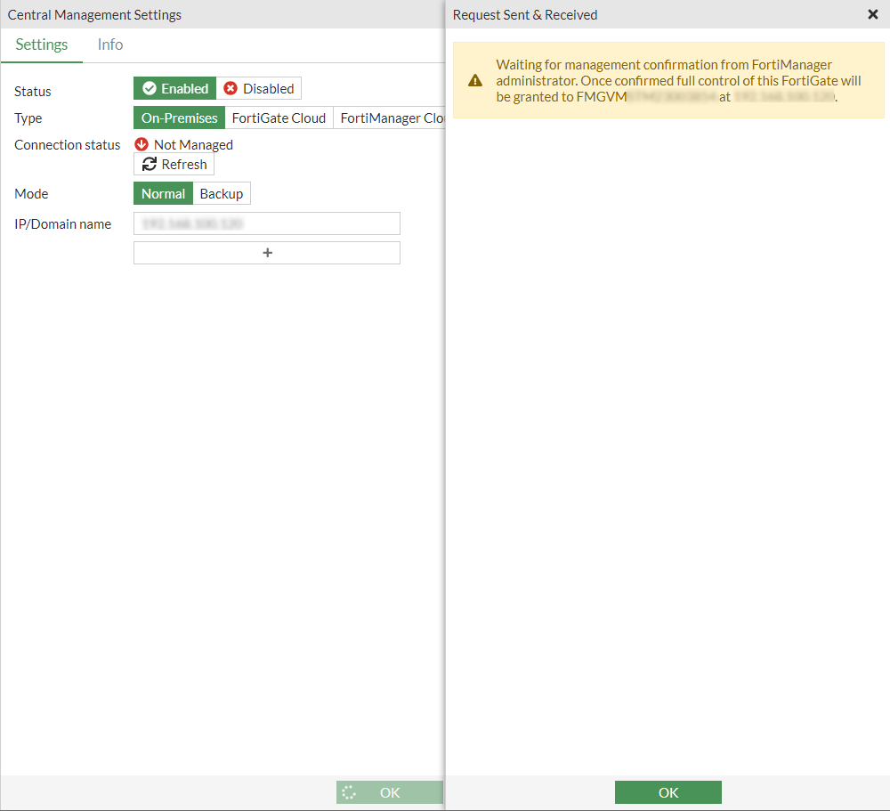 - Approve the FortiManager serial number returned by the FortiManager server certificate. This ensures that the administrator is connecting the FortiGate to the desired FortiManager.
