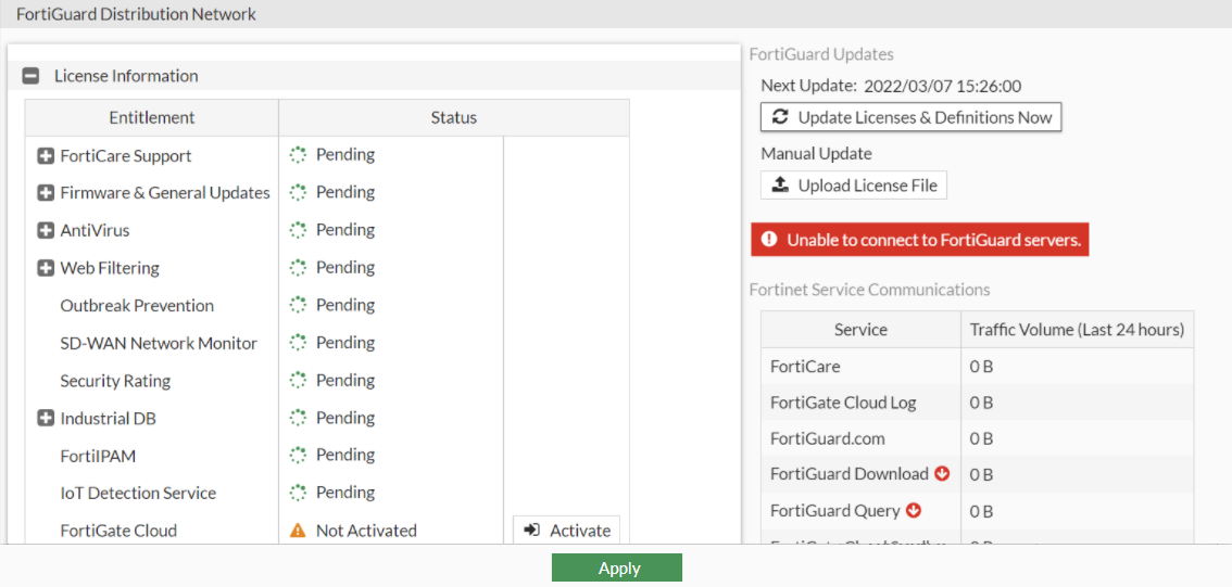 3. In FortiOS, go to System > FortiGuard. Currently, the status for all services is Pending.