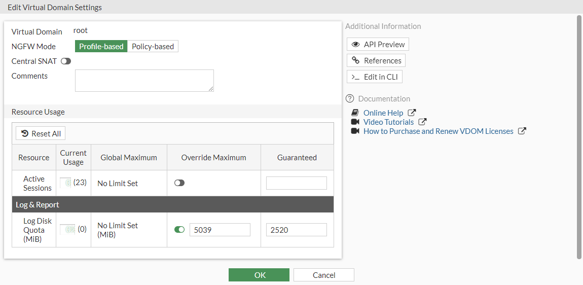 Select the VDOM whose resources need to be configured and click Edit.
