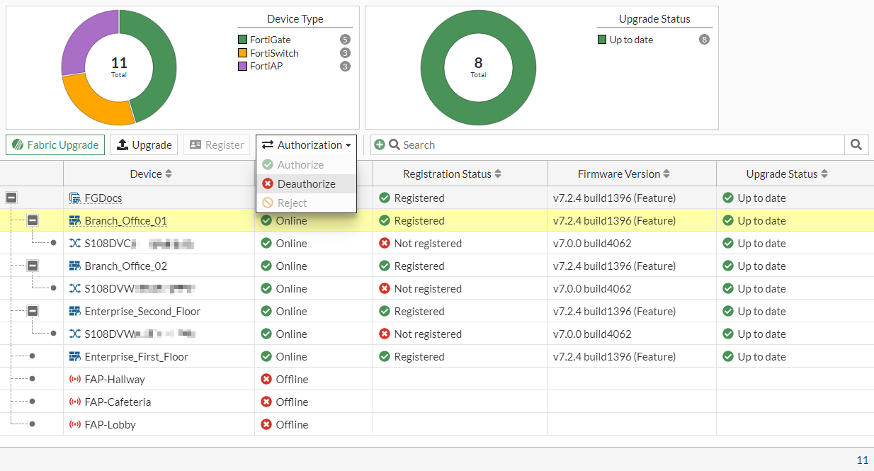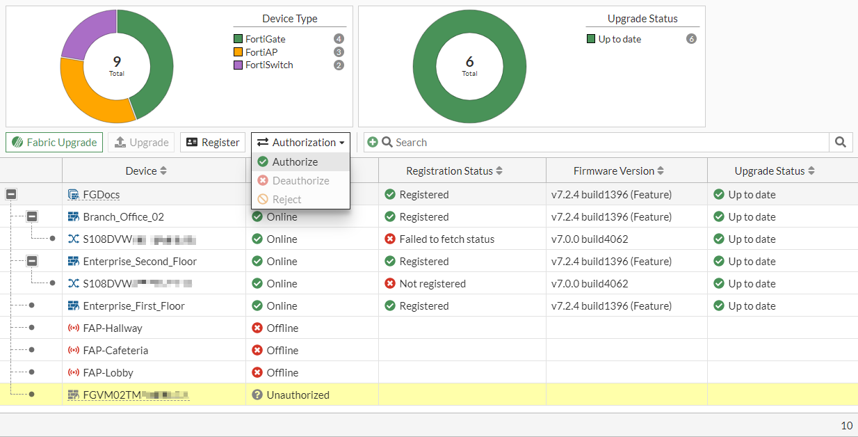 Refresh the page. The FortiGate's status is now Unauthorized.
