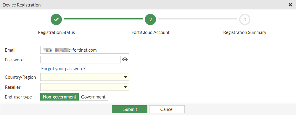 Enter the required information (password, country/region, reseller, and end-user type).