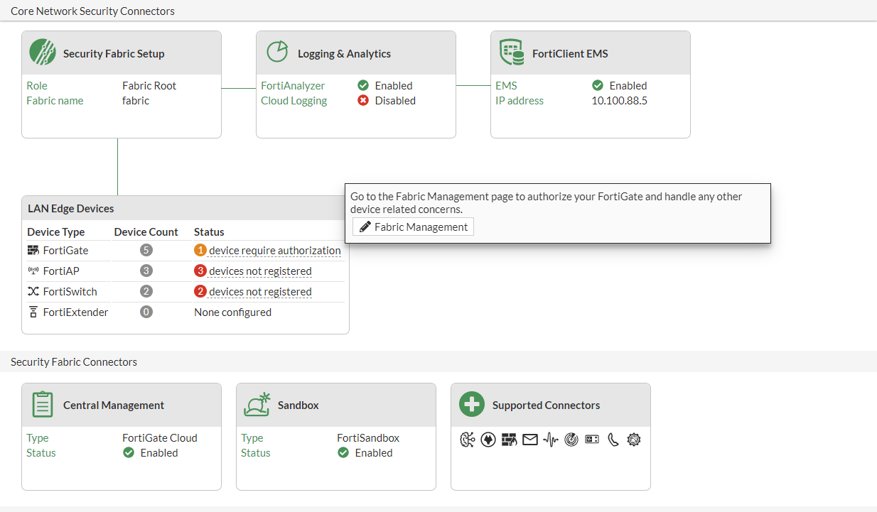 The Supported Connectors card displays the icons of different Fortinet devices that support full Security Fabric integration. See Configuring supported connectors for more information about configuring supported Fabric connectors.