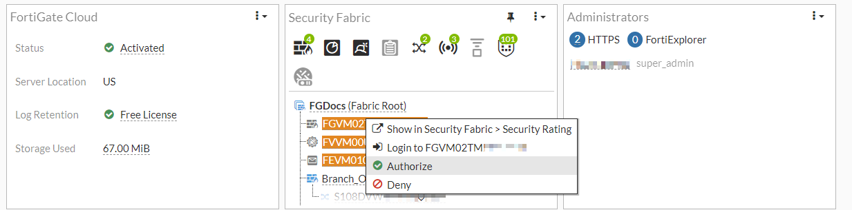 A downstream device can be authorized in the root FortiGate's GUI by using the Fabric Management page (see Authorizing devices for more information) or the Security Fabric widget. In this example, a downstream FortiGate is authorized using both GUI options.