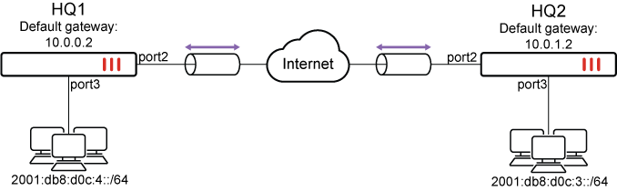 • HQ2 port2 IPv4 address is 10.0.1.1 and port3 IPv6 address is 2001:db8:d0c:3::e.