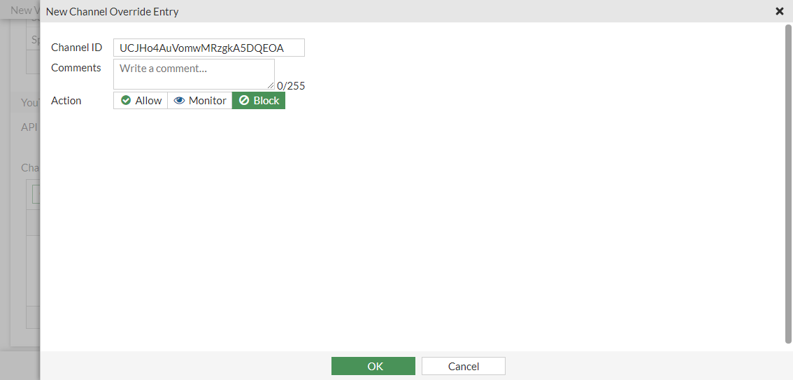 The Channel override list allows the channel action to override the category action. A category can be blocked, but certain channels in that category can be allowed (see Configuration with YouTube channel override).