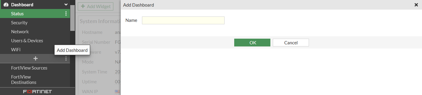 You can combine widgets to create custom dashboards. You can also use the dropdown in the tree menu to switch to another device in the Security Fabric.