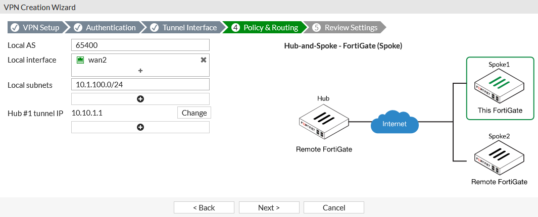 8. The summary shows details about the set up spoke. The Local address group and Tunnel interface can be edited directly on this page.