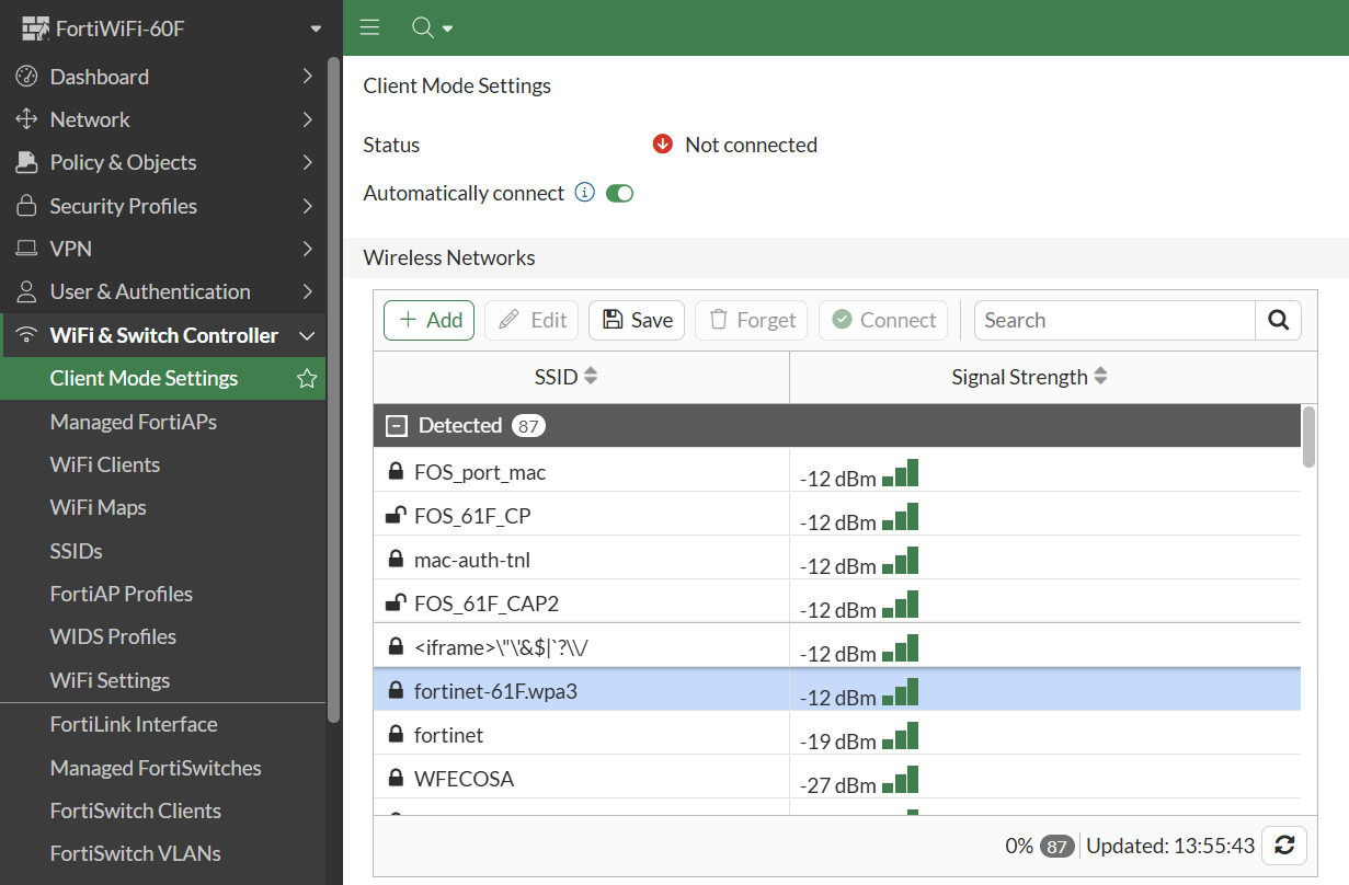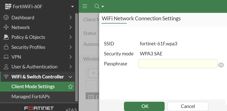 When a FortiWiFi local radio is operating in Wireless Client mode, a new Client Mode Setting page is available under the WiFi & Switch Controller menu.