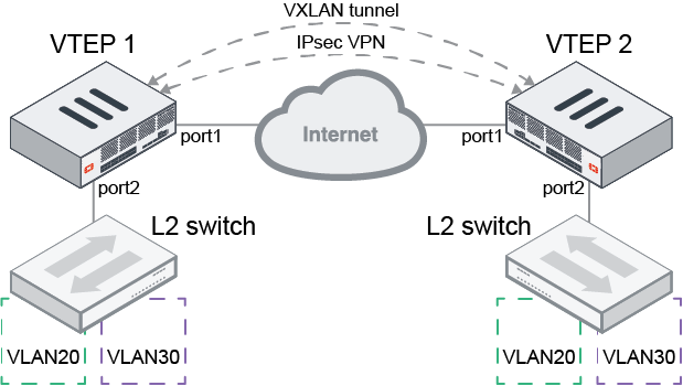 In scenarios where VTEPs are located in different sites and traffic must be secured between the sites, VXLAN will need to be encrypted over IPsec. The VXLAN interface must use the IPsec interface as its outgoing interface. The remote-ip must be configured as the IP of the remote IPsec gateway. The VXLAN interface can be combined with port2 into the same L2 network using a software switch or virtual wire pair. Devices under the L2 switches can communicate with each other.