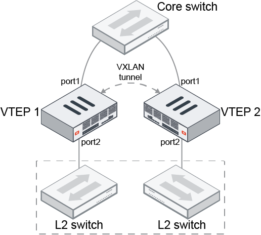 In this topology, a FortiGate (VTEP 1) is configured with a VXLAN interface over port1 where the remote-ip points to port1 of VTEP 2. The VXLAN interface and port2 can be associated with the same L2 network by making them members of either a software switch or a virtual wire pair. Devices under the L2 switches are part of the same L2 network.