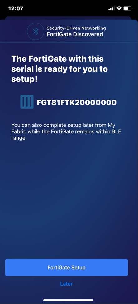 If the app has detected the FortiGate device, the device's serial number will be shown.