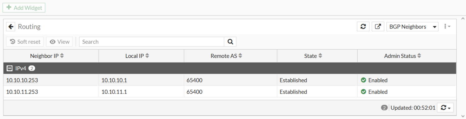 Branch1 # get router info bgp neighbors 10.10.10.253 advertised-routes VRF 0 BGP table version is 5, local router ID is 10.20.1.2 Status codes: s suppressed, d damped, h history, * valid, > best, i - internal Origin codes: i - IGP, e - EGP, ? - incomplete Network Next Hop Metric LocPrf Weight RouteTag Path *>i10.1.1.0/24 10.10.10.1 100 32768 0 i <0/-> *>i10.20.1.2/32 10.10.10.1 100 32768 0 i <0/-> Total number of prefixes 2