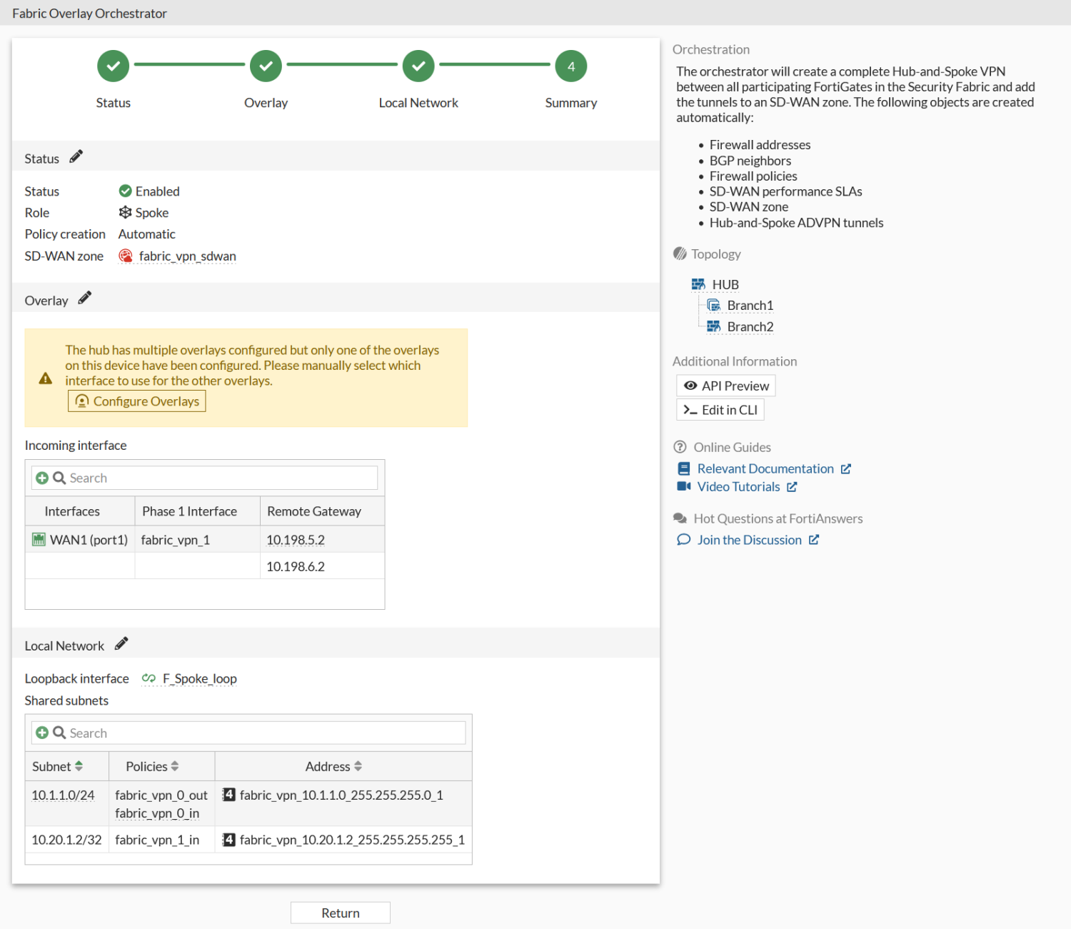 A hub typically includes two incoming interfaces, but additional interfaces can be configured if needed. On downstream devices, the following warning is displayed on the Fabric Overlay Orchestrator page that The hub has multiple overlays configured but only one of the overlays on this device have been configured. Please manually select which interface to use for the other overlays.