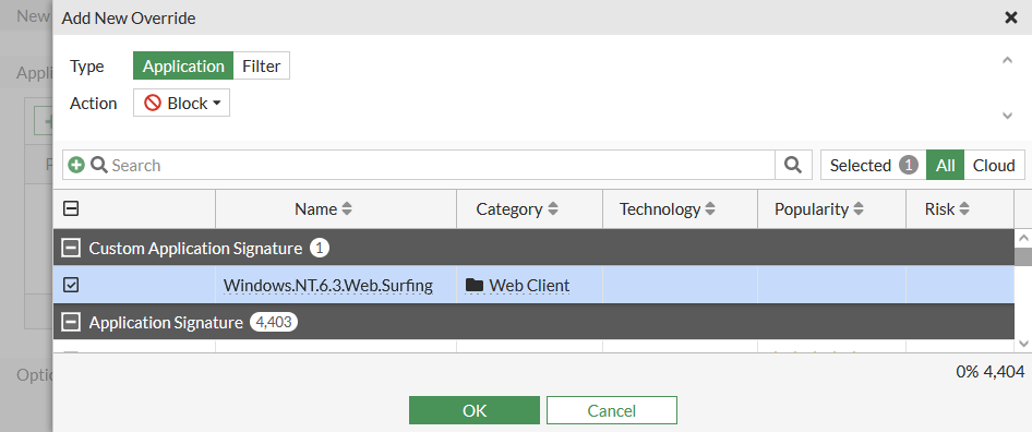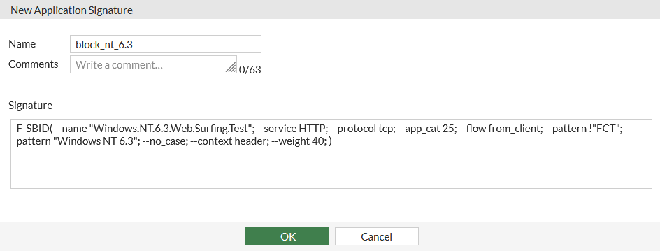 This signature scans HTTP and HTTPS traffic that matches the pattern Windows NT 6.3 in its header. For blocking older versions of Windows, such as Windows XP, you would use the pattern Windows NT 5.1. An attack ID is automatically generated when the signature is created.