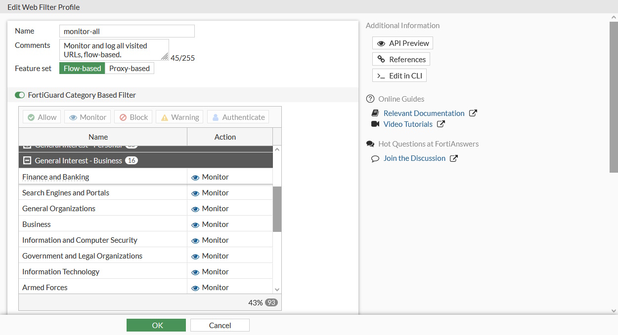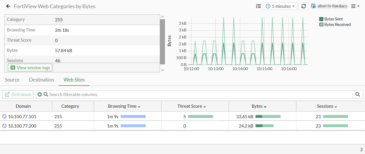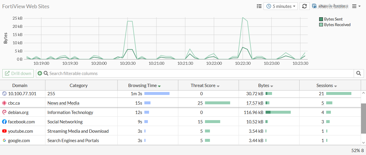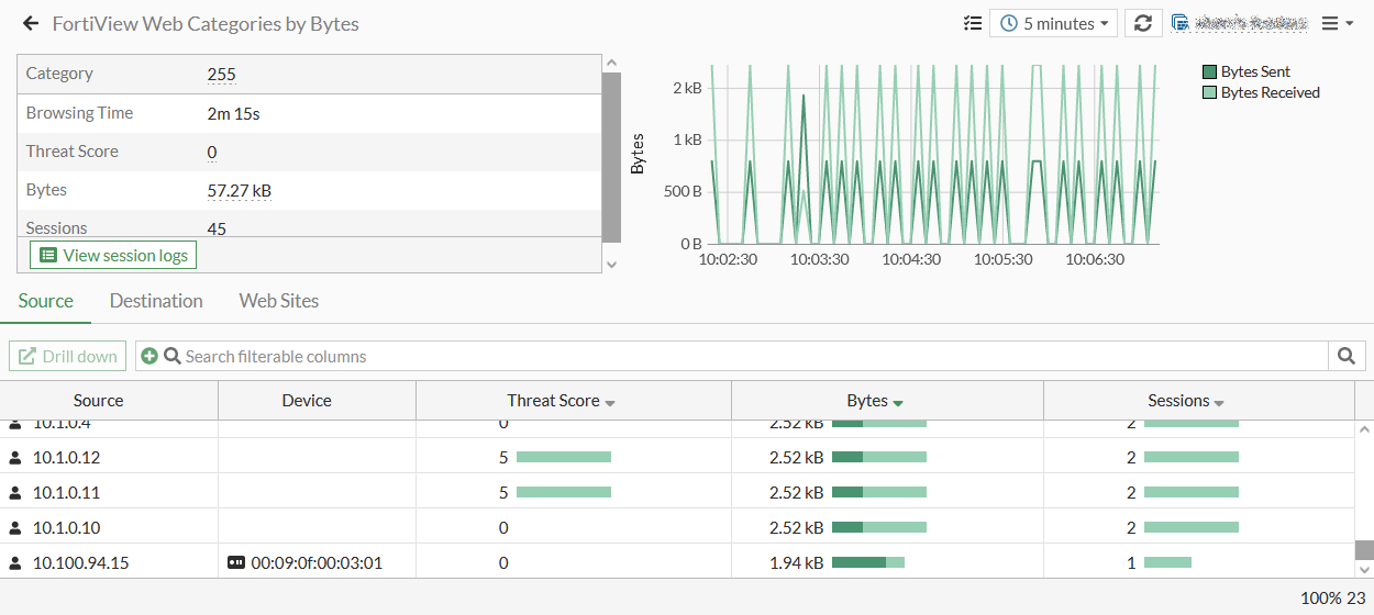 You can use FortiGuard web categories to populate the category fields in various FortiView monitors such as FortiView Web Categories, FortiView Websites or FortiView Sources. To view the categories in a monitor, the web filter profile must be configured to at least monitor for a FortiGuard category based on a web filter and applied to a firewall policy for outbound traffic.