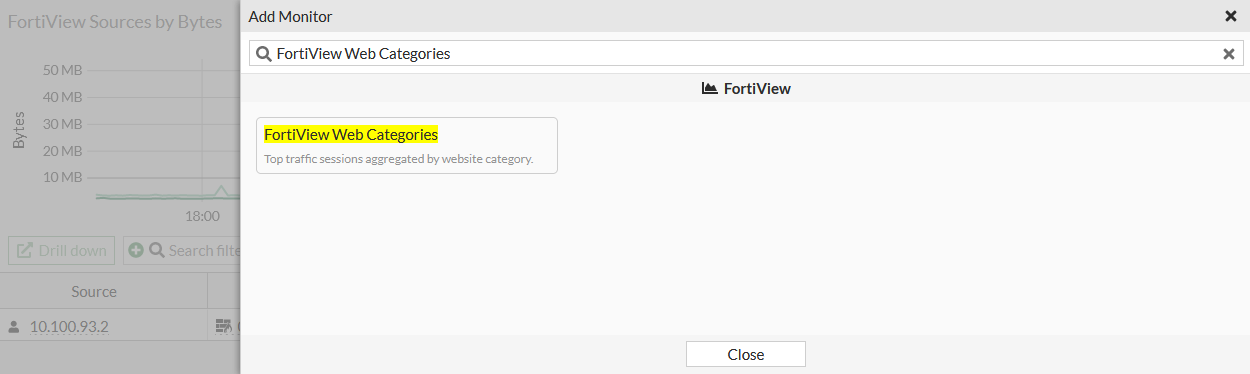 In the Search field, type FortiView Web Categories and click the Add button next to the monitor name.