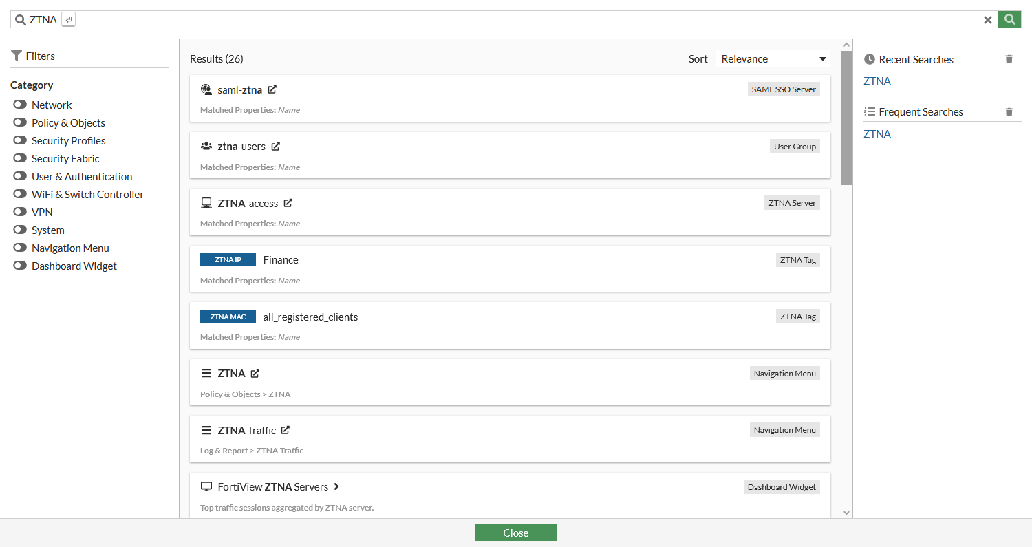 In this example, searching for the word ZTNA yields the following results: