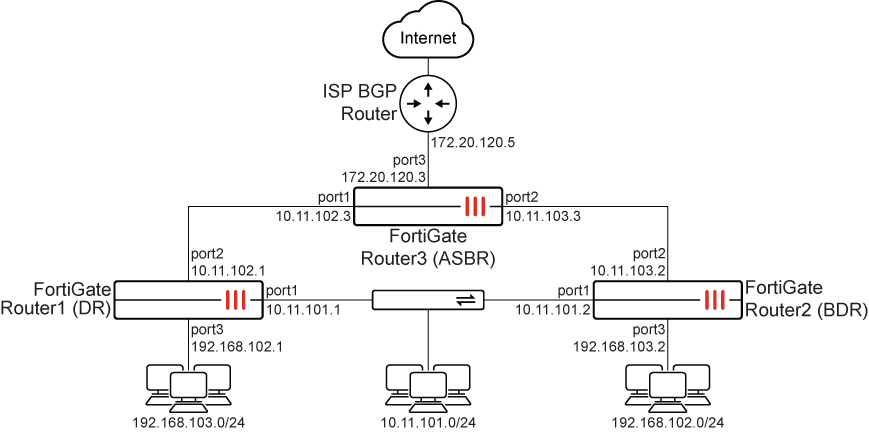In this example, three FortiGate devices are configured in an OSPF network.