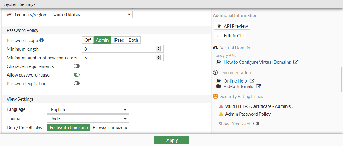FortiGate allows you to create a password policy for administrators and IPsec pre-shared keys. With this policy, you can enforce regular changes and specific criteria for a password policy, including: