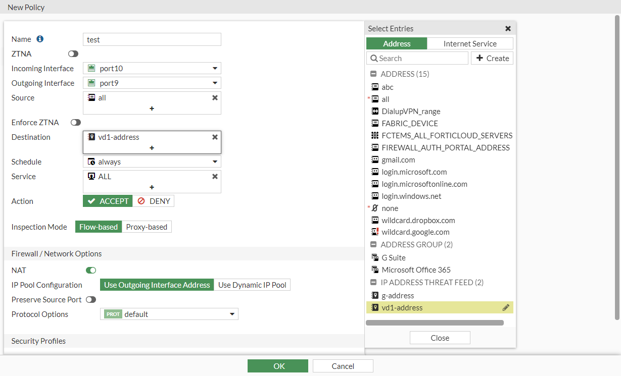 - For Destination, select vd1-address. Since this policy is configured under vd1, g-address can also be set as the destination.