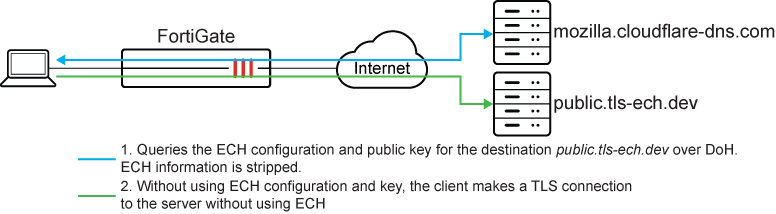 If the FortiGate is performing deep inspection, it always strips the ECH extension from an ECH, effectively forcing the client browser to use a non-ECH TLS connection. |