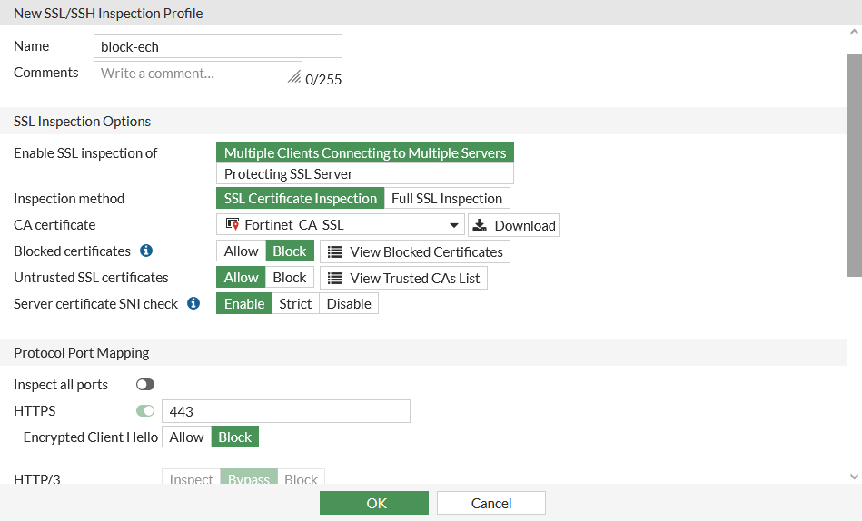 Blocking/allowing ECH is only configurable in an SSL/SSH inspection profile with Inspection method set to SSL Certificate Inspection. |