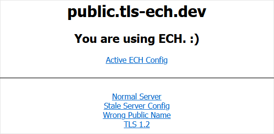 In a browser, go to https://public.tls-ech.dev to see that ECH is not being used: