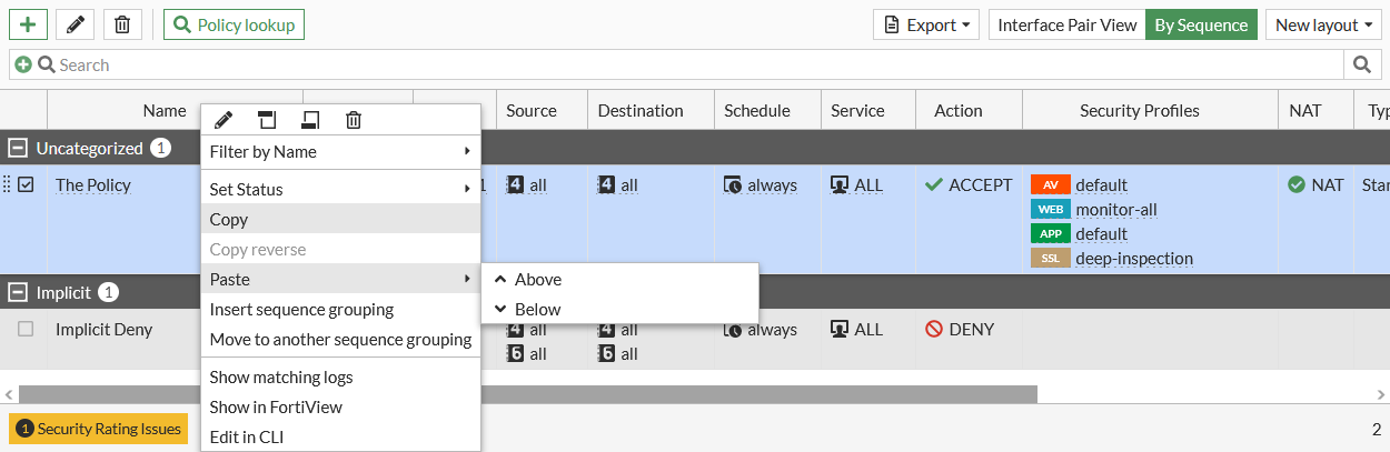 In some tables, rows can be copied and pasted using the right-click menu. For example, a policy can be duplicated by copying and pasting it.