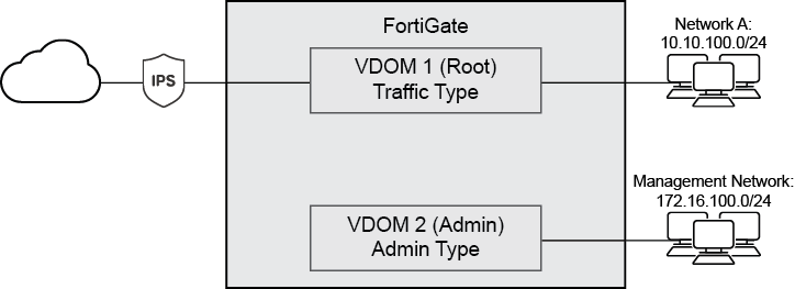 The administrative VDOM type can be used to limit administrative access to the FortiGate using SSH, HTTPS and so on to administrators working from a management network. Administrators may be limited to management settings or may have global privileges to access other VDOMs. The user or tenant network (depicted as Network A in the diagram) uses a traffic type VDOM, which allows traffic to pass through it like a regular firewall and allows configuration of firewall-related settings. This configuration can improve security if the management network is a closed network and administrative access is not enabled on any interfaces on the traffic VDOM.
