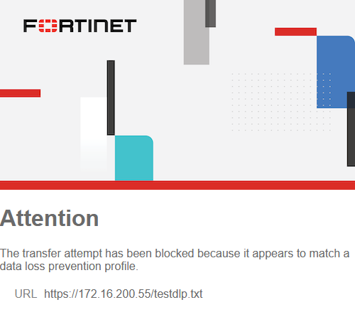 The FortiGate intercepts the traffic using deep inspection and blocks the traffic as it matches the DLP profile configured on this FortiGate. See Sample log for a log sample.