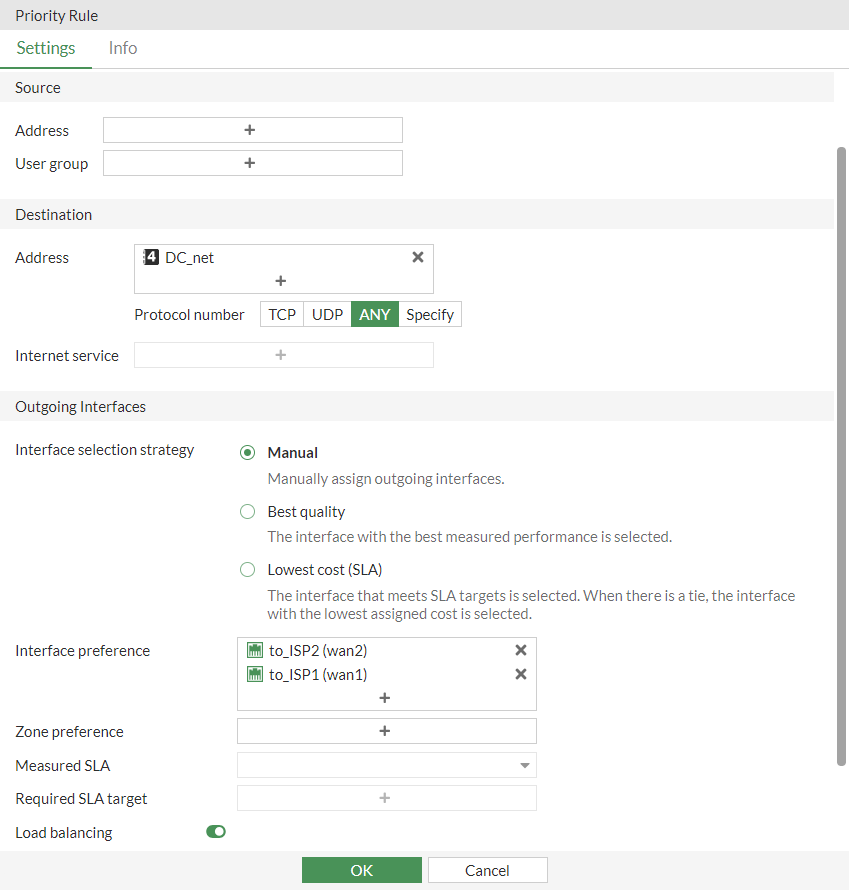 Name Type a name for the rule. Source (Optional) Specify a Source address and/or User group. Destination Specify the destination using an Address object or an Internet Service or an Application. Zone preference Specify one or more SD-WAN interfaces or zones.
